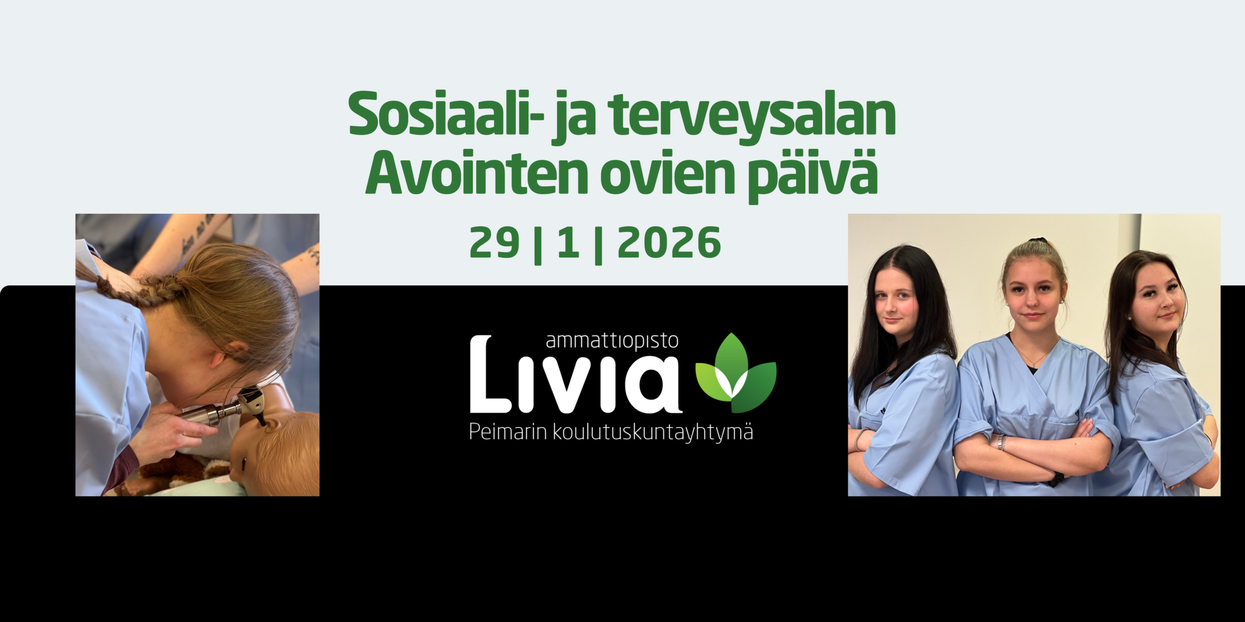 saaga2026-01-26T10:20:57+02:00Tervetuloa tutustumaan sosiaali- ja terveysalaan Avoimiin oviin 29.1.2026 klo 13-17, Kaarinaan! Tule kuulemaan lähihoitajan perustutkinnosta, lisäkouluttautumisesta ja oppisopimuksesta. Pääset näkemään, miten opiskelu meillä oikeasti toimii, tapaamaan opettajia, opinto-ohjaajia ja opiskelijoitamme sekä tutustumaan moderneihin oppimisratkaisuihin ja käytännön hoitotyöhön. Paikalle ovat tervetulleita aivan kaiken ikäiset alasta kiinnostuneet. Jos olet pohtinut sosiaali- ja terveysalalle hakeutumista avointen ovien päivässä saat varmasti inspiraatiota alasta. Opiskelijamme ja opettajamme ovat valmistelleet mielenkiintoisia pisteitä, joissa pääset tutustumaan aloihin. Pääset samalla näkemään millaisissa tiloissa oppiminen Kaarinassa tapahtuu. Maksuton avointen ovien päivä järjestetään Kaarinan keskustassa osoitteessa Kiesikatu 3. Paikalle on helppo saapua omalla autolla tai linja-autolla. Pihalta löytyy ilmaisia pysäköintipaikkoja. [...]