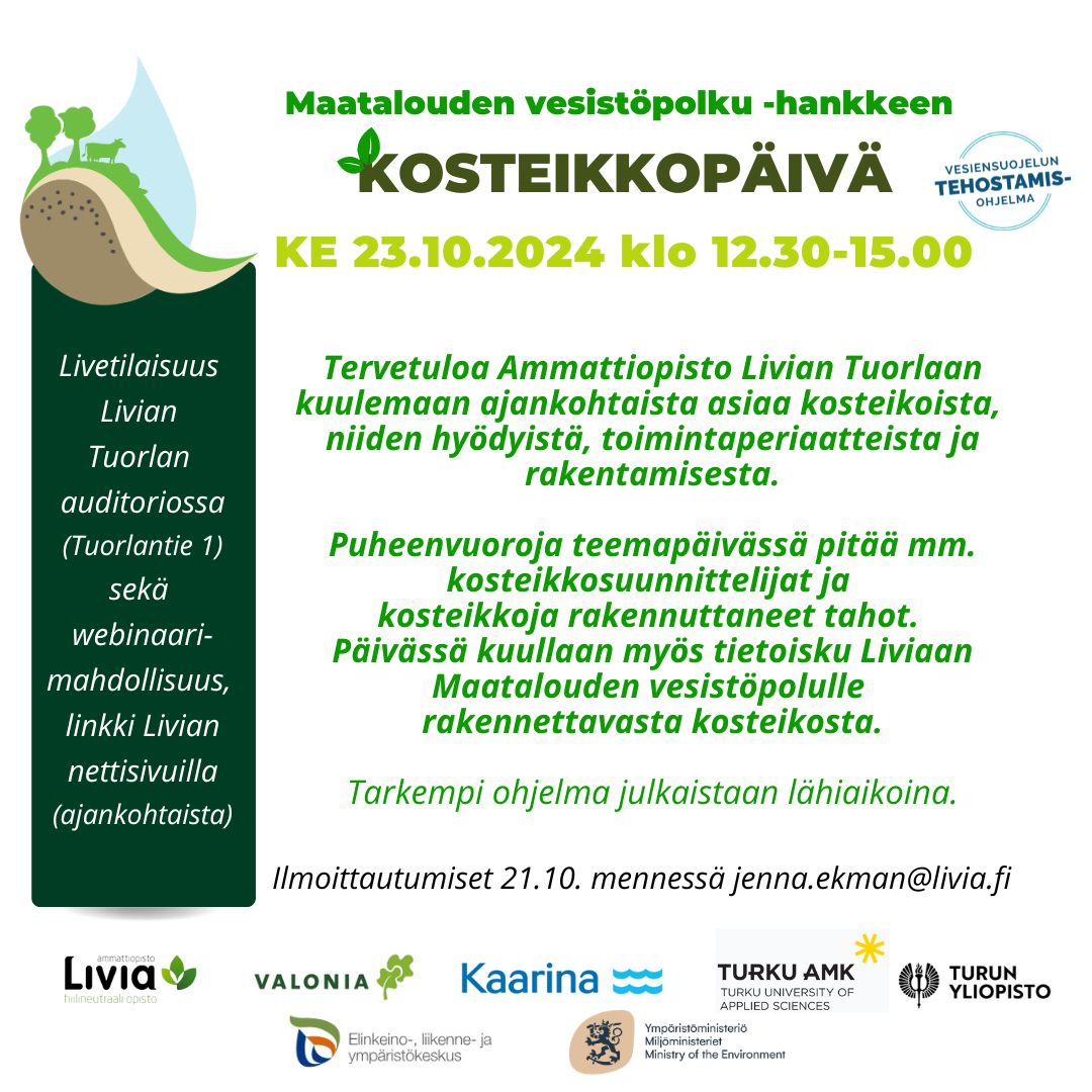katri2024-11-26T08:22:50+02:00Maatalouden vesistöpolku -hankkeen peltometsäviljelyn teemapäivä perjantaina 29.11.2024 klo 9.30-15.30 Tervetuloa Ammattiopisto Livian Tuorlaan kuulemaan ajankohtaista asiaa peltometsäviljelystä, peltometsäviljelmän perustamisesta ja kasvilajivalinnoista sekä agroforestryn vaikutuksista vesistöihin ja ympäristöön. Puheenvuoroja teemapäivässä pitää puustoisen maatalouden osaajat eri organisaatioista. Päivässä kuullaan myös tietoisku Liviaan Maatalouden vesistöpolulle istutettavasta agrometsälohkosta. Tilaisuus on suunnattu maatalous-, ympäristö- ja vesistöalan ammattilaisille, opiskelijoille ja muille aiheesta kiinnostuneille. Tilaisuus on mahdollista kuunnella paikan päällä tai live-webinaarin välityksellä. Linkki webinaariin lisätään tälle sivulle ennen teemapäivän alkua. Tilaisuus on maksuton ja hanke tarjoaa iltapäiväkahvin lisukkeineen. Tutustu tarkempaan ohjelmaan alta. Ilmoittautumiset 27.11.2024 mennessä jenna.ekman@livia.fi [...]