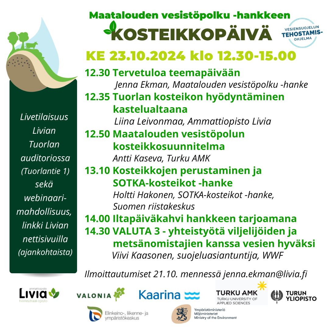 Tervetuloa Ammattiopisto Livian Tuorlaan kuulemaan ajankohtaista asiaa kosteikoista, niiden hyödyistä, toimintaperiaatteista ja rakentamisesta. Puheenvuoroja teemapäivässä pitää mm. kosteikkosuunnittelijat ja kosteikkoja rakennuttaneet tahot. Päivässä kuullaan myös tietoisku Liviaan Maatalouden vesistöpolulle rakennettavasta kosteikosta. Tilaisuus on suunnattu maatalous-, ympäristö- ja vesistöalan ammattilaisille, opiskelijoille ja muille aiheesta kiinnostuneille.